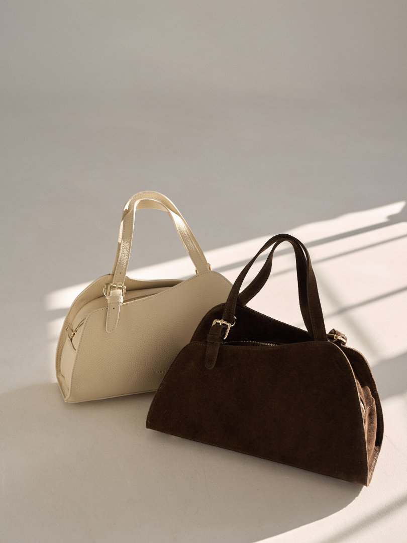 Skórzana zamszowa torebka w kolorze brązowym z dodatkowym paskiem. Wykonana z włoskiej skóry naturalnej, zachwyca niebanalną i elegancką formą. Torebka pomieści najpotrzebniejsze rzeczy, nie tracąc przy tym na lekkości i wygodzie noszenia. Dzięki uniwersalnemu fasonowi doskonale pasuje zarówno do eleganckich stylizacji jak i casualowych. Do torebki dołączony jest dodatkowy pasek z możliwością regulacji.