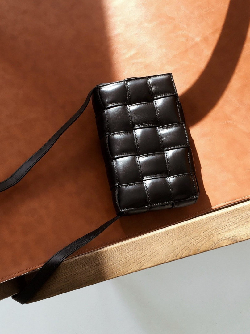 Skórzana torebka w kolorze czarnym o plecionej strukturze. Uszyta z najwyższej jakości włoskiej skóry naturalnej. Pojemna, zapinana na zatrzask z regulowanym paskiem. Środek torebki pokryty zamszowym materiałem.